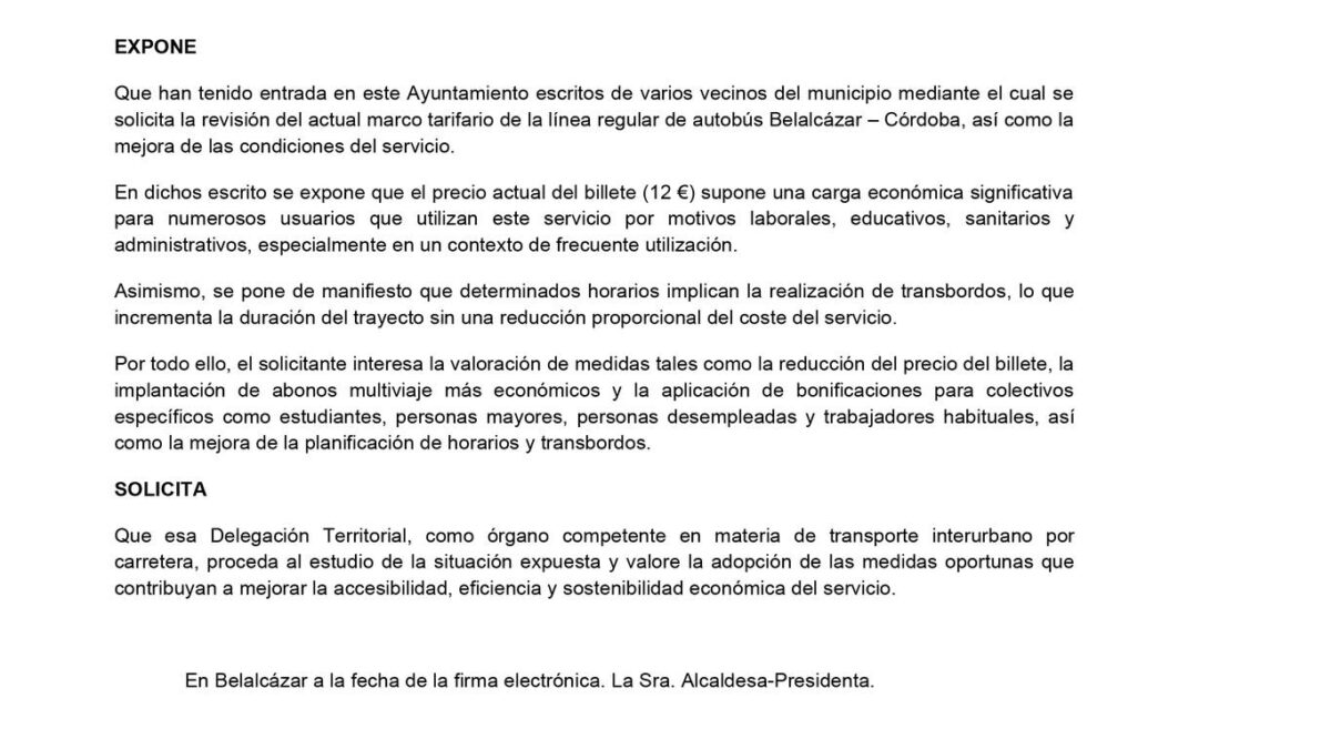 20/04/2026El Ayuntamiento de Belalcázar ha presentado ante la Delegación Territorial de Fomento, Articulación del Territorio y Vivienda en Córdoba una solicitud formal para el estudio y revisión del servicio de transporte que une nuestro municipio con la capital.